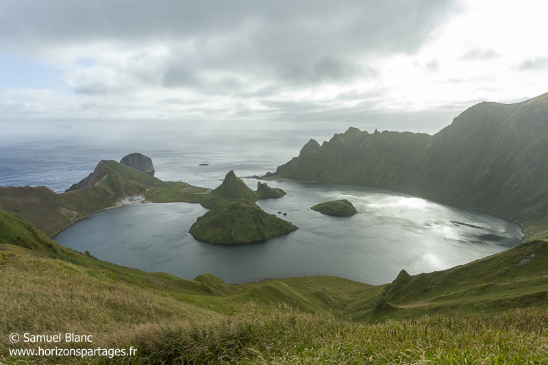 Hier soir j’ai vécu un de mes plus grands moments de mon expérience de naturaliste ! En début de soirée, nous sommes entrée dans la caldeira de l’île Yankicha qui se situe quasiment au centre de l’archipel des Kouriles. Les pentes intérieures de cette caldeira sont occupées par plus de 2 millions d’oiseaux dont les stariques cristatelles Aethia cristatella et les stariques pygmées Aethia pygmaea. C’est sous un beau ciel bleu et une lumière du soir rasante, que nous avons assisté au spectacle de l’entrée dans la caldeira de vols de milliers d’oiseaux venant de haute mer. Un spectacle féérique, ponctué de temps à autre par les appels de deux renards arctiques qui se répondaient d’un bout à l’autre de l’île. Deux heures plus tard, alors que des oiseaux regagnaient encore la caldeira, nous sortîmes, et là sur l’eau nous attendaient des dizaines de milliers de stariques pygmées posées ! La surface de la mer était tout simplement couverte d’oiseaux, décollant peu à peu à notre approche…