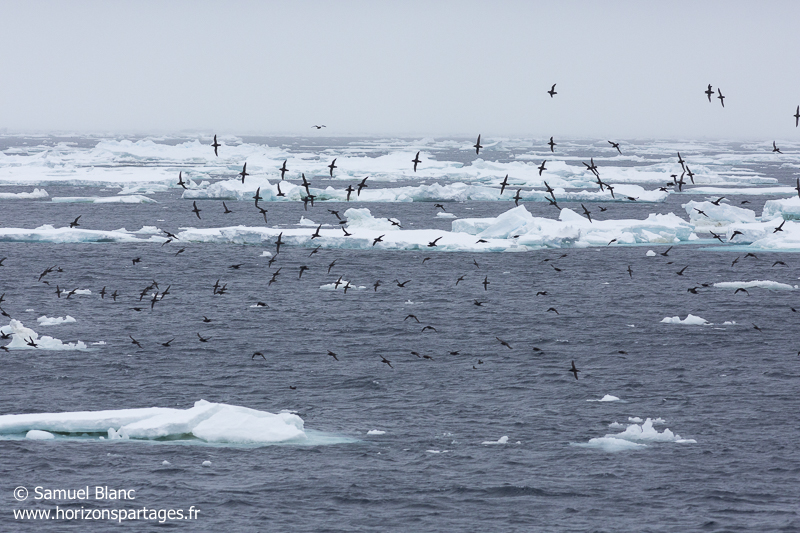 Que se soit à l’approche de la mer de Ross ou en mer de Béring, nous retrouvons à chaque saison les puffins à bec grêle. Les rencontres avec cet oiseau sont bien souvent spectaculaires. Il y a quelques années, non loin de la côte de la Tchoukotka, nous avions changé de cap pour aller constater que le véritable vortex sombre qui se laissait entrapercevoir sur l’horizon, était en fait un regroupement de plusieurs centaines de milliers d’individus. Le bruit de leurs ailes au décollage, mêlés au son du souffle de quelques baleines venus s’alimenter dans le même espace, reste un souvenir mémorable. Et que dire que l’observation de cette même espèce six mois plus tard à l’autre bout de la planète parmi les glaces à l’approche de l’Antarctique ?